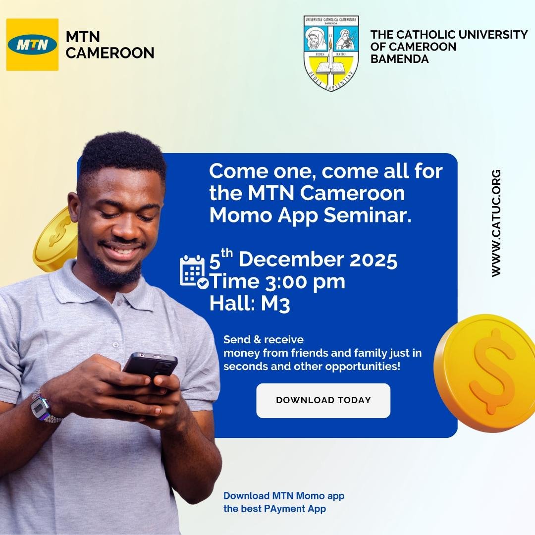 ✨ Join us this 5th December 2025 at 3:00 pm in Hall M3 for the MTN Cameroon MoMo App Seminar! 🚀 Learn how to send and receive money in seconds and explore exciting opportunities. Don’t miss out! 💛📲