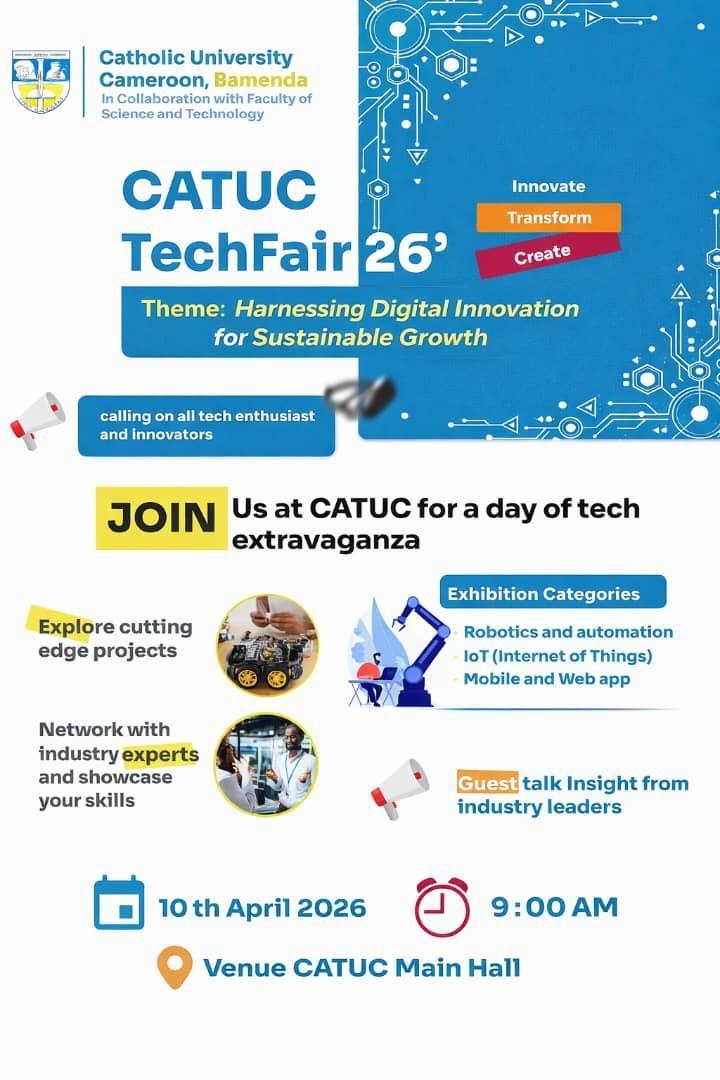 ⚙️🚀 The future of tech is being built RIGHT HERE at CATUC Bamenda! Calling all tech enthusiasts, innovators, and problem-solvers — CATUC TechFair ’26💻🤖