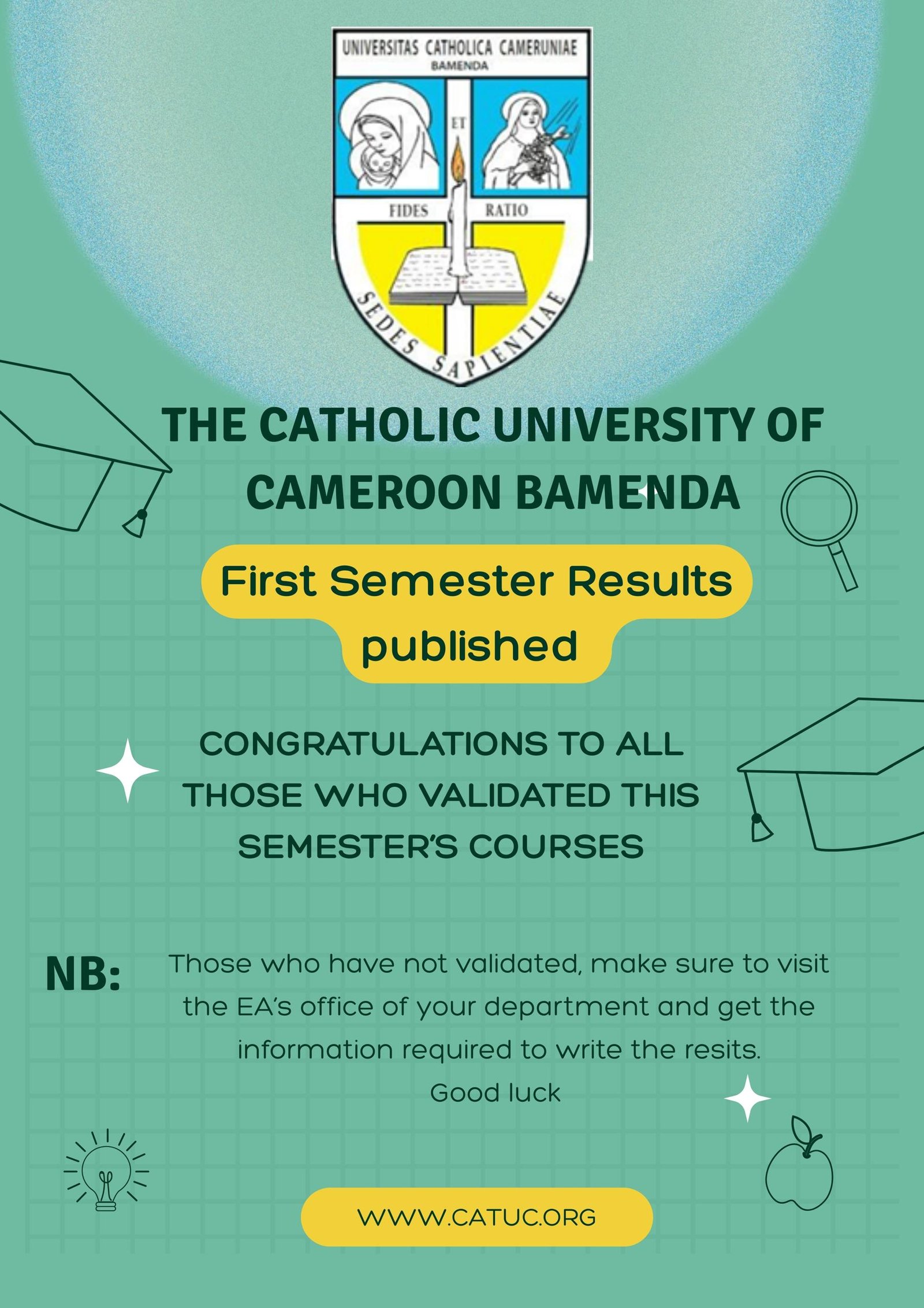 Academics First Semester Results published ByKellyzoe February 25, 2026February 25, 2026 Results published! 📢✨CATUC Bamenda drops the first semester outcomes. Massive shoutout to all who crossed the finish line and validated—focus, and hard work got you here! 🔥🙏